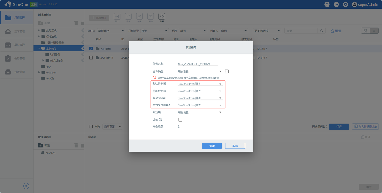 调整了创建任务流程,在创建任务界面,增加选择控制器匹配的算法,提升了用例共享的灵活性和算法验证的便捷性;