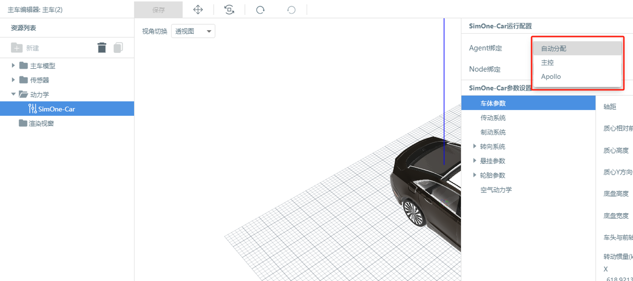 点击 主车编辑器 左侧的 动力学 文件夹 SimOne-Car,选择 Agent。