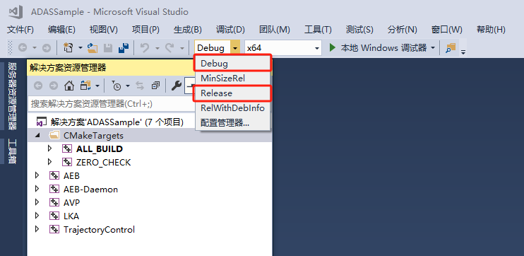 1.用 Visual Studio 2017 打开 ADASSample 工程,编译模式切换为 Release 或 Debug 。