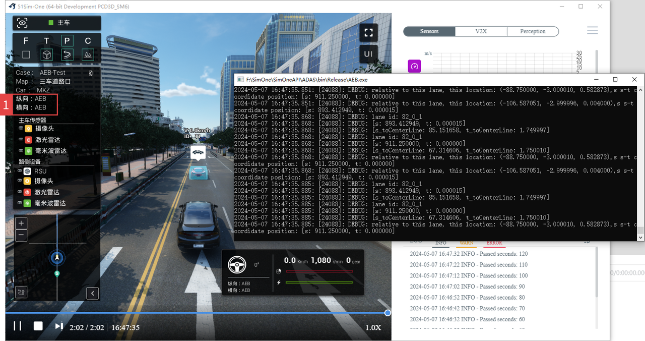 保证 AEB.exe 在用例运行前打开 ,若成功接入则在渲染视窗中会 展现算法效果 (例如 接入 AEB 算法后主车会在对手元素后一段距离减速至 0 m/s),且 横纵向算法 也会以此改变。