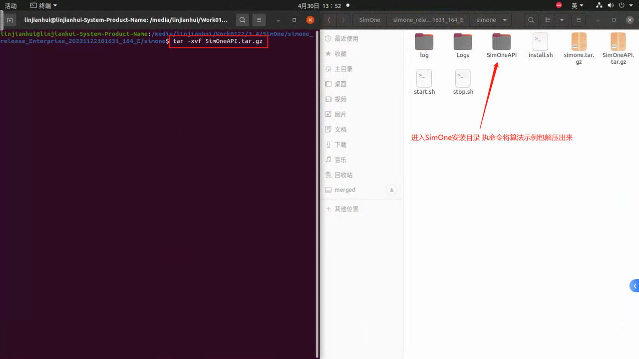 tar -xvf SimOneAPI.tar.gz解压算法示例包。