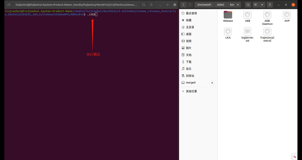 bash rebuild_release.sh命令 生成可执行文件 ,并在 /SimOne/ SimOneAPI/ADAS/bin 目录当中查看 可执行文件 AEB 。