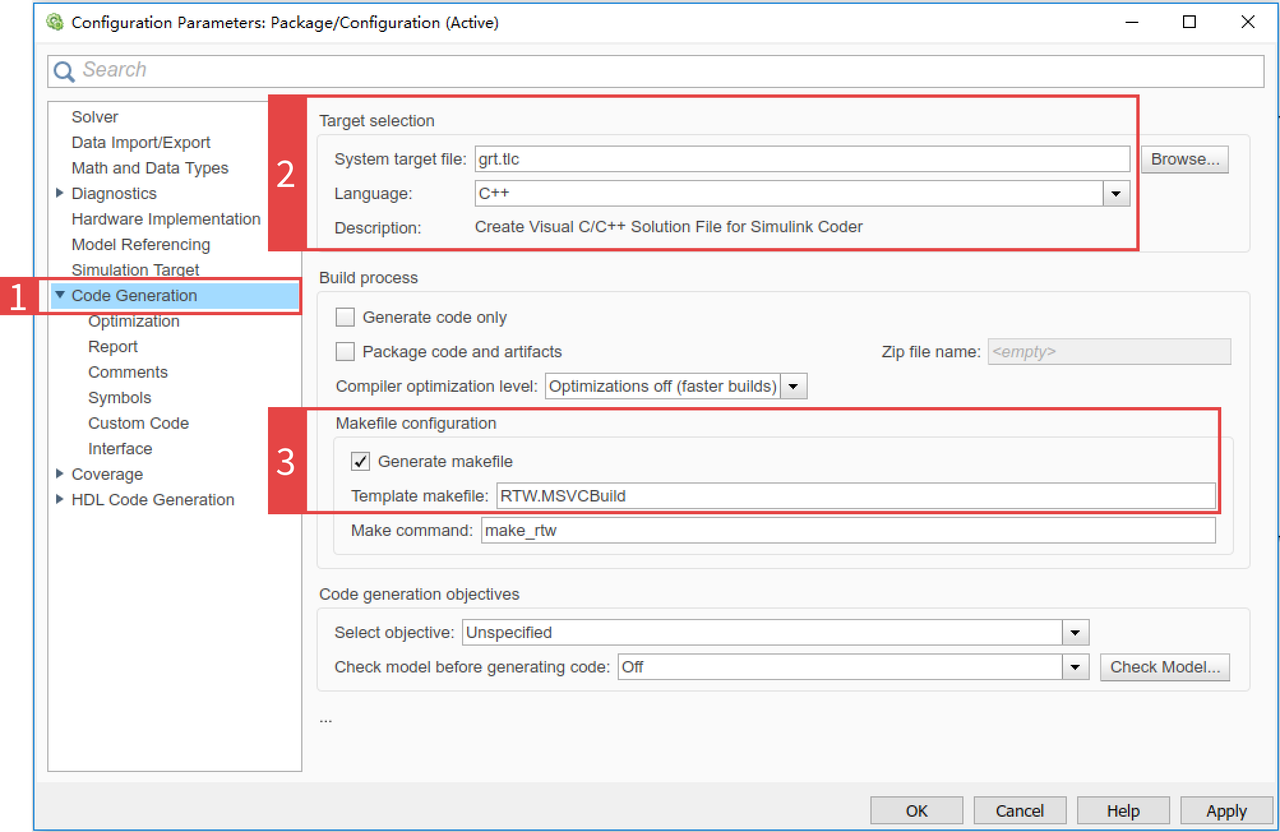 Target selectionSystem target file设置成grt.tlc(Create Visual C/C++ Solution File for Simulink Coder)Language选择C++;