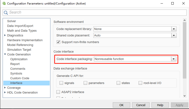 Code Generation下的Interface标签,右侧选项Code Interface设置成Nonreusable function因为打包成一个可执行文件,所以不存在代码复用。