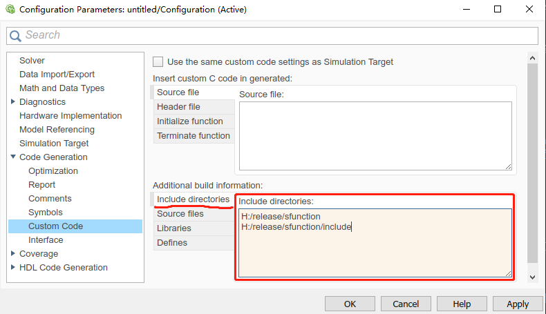 Code Generation下的Custom Code标签,右侧选项Include directories中添加头文件所在路径(SimOne 的 Matlab->Simulink 文件夹所在路径和SDK->include 文件夹所在的路径)