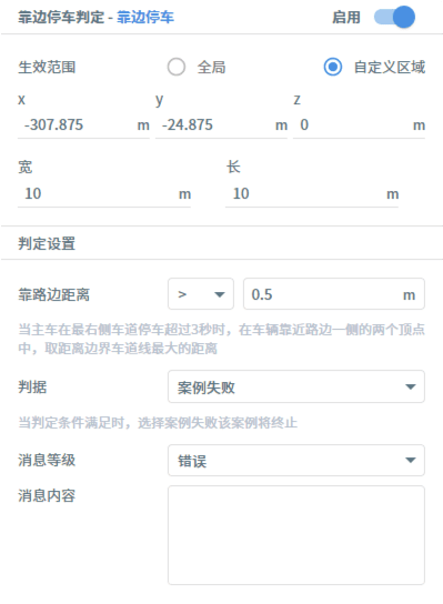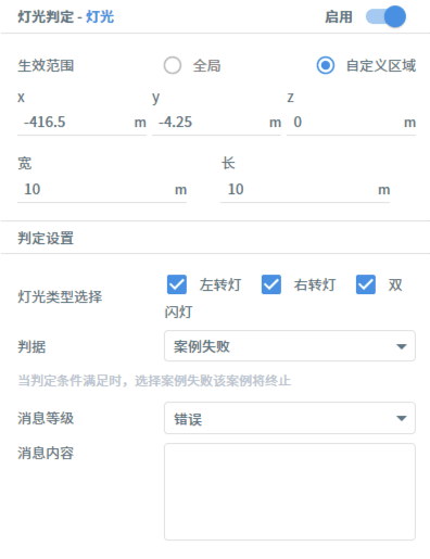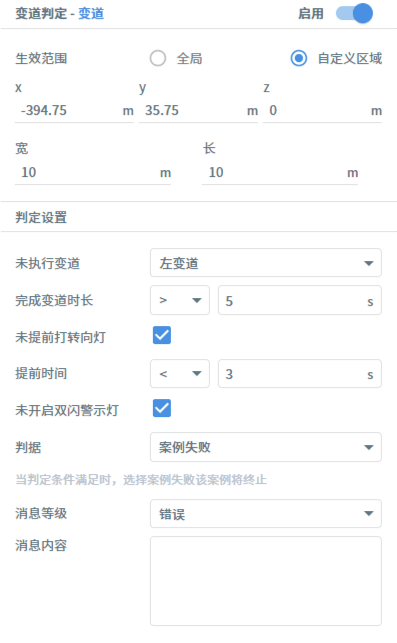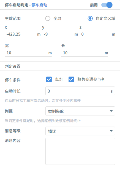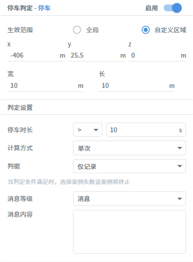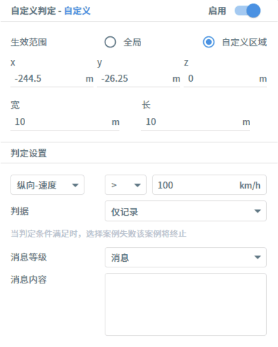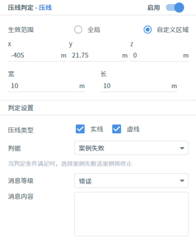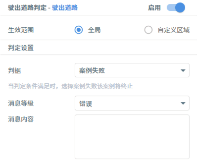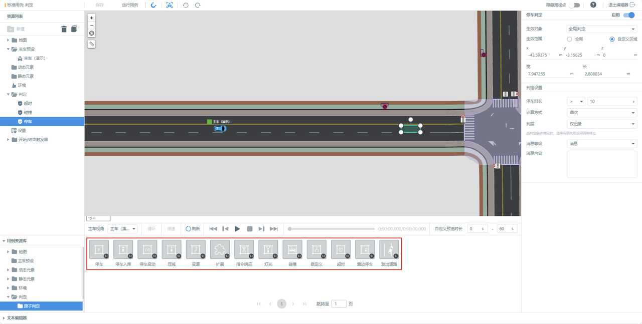 用例资源库-判定包括超时、停车、碰撞、压线、变道、自定义条件等判定条件的设置,他们的共同设置为:生效范围分为全局和自定义区域,用户可按需设定。