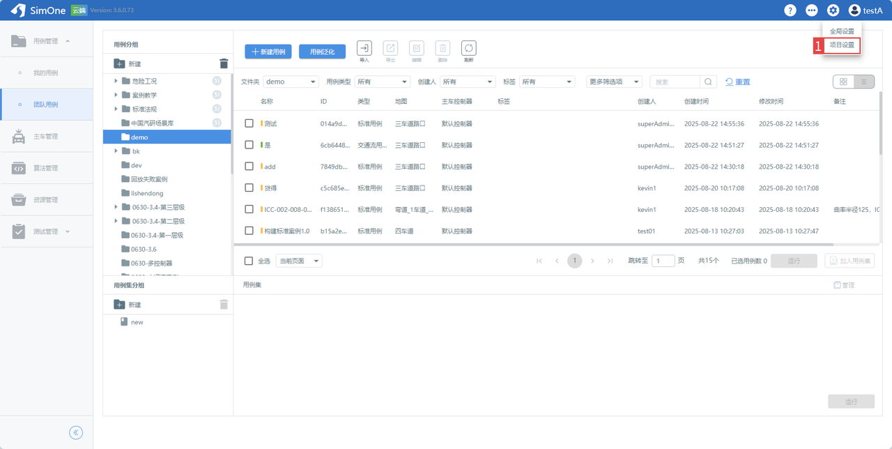 项目隔离机制核心价值:面向 SimOne 协作版,平台通过项目隔离机制实现用例、主车、算法、资源、任务等内容的独立管理,既能满足企业内部数据组织效率提升与跨团队协作需求,又能确保各项目间资源、任务互不干扰、清晰可控;目前仅支持「默认团队」一个默认项目,后续版本将逐步开放多项目并行功能,适配更复杂的团队协作场景。
