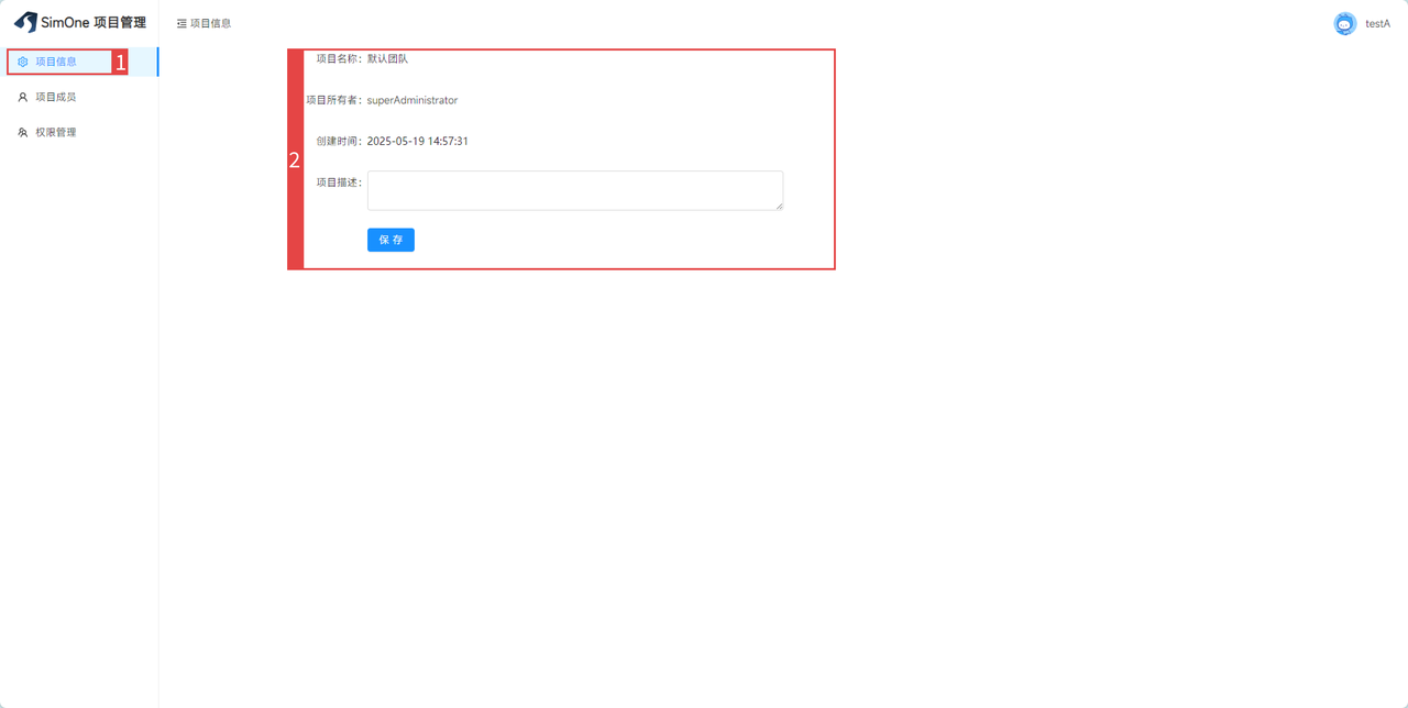 项目设置操作入口(需项目管理员权限):在 SimOne 平台中,若当前账号具备项目管理员权限,可通过「点击平台右上角【设置】→【项目设置】」的路径,进入项目信息管理页面,在此页面可完成项目名称、描述、成员权限等内容的配置与维护。