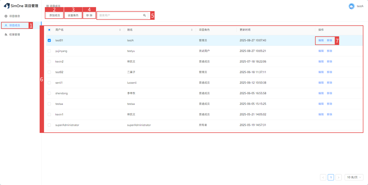 | 5 | 成员列表 | 展示当前项目的成员列表,可查看成员的用户名、姓名、项目角色等信息 |