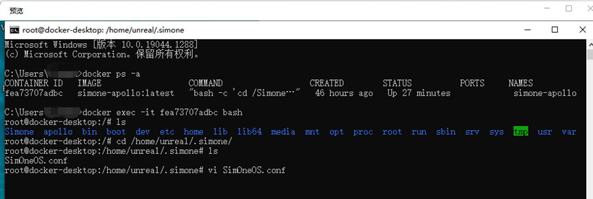 步骤 1 执行无误,但是 apollo 依然显示没有连接成功,此时可能是重复安装导致容器内 apollo 的 Agent uuid 被占用,打开命令行执行以下程序,删除容器内 SimOneOS.conf 文件,然后重新安装 apollo 。